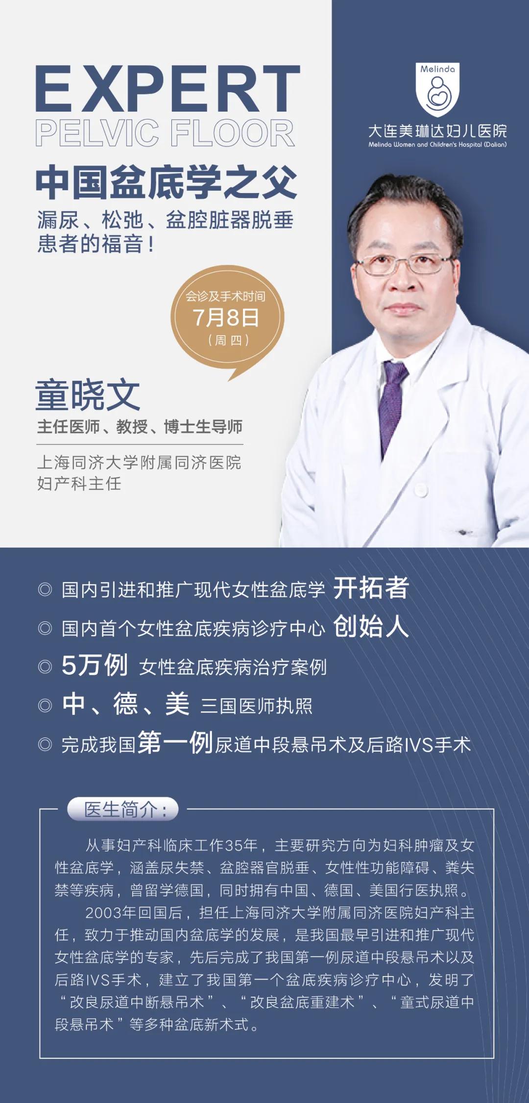 童晓文教授曾留学德国,又在美国研修工作5年,在德国研修工作8年,是拥有中、德、美三国行医执照的归国医学医生。2003年回国后,他便开始着手推动国内盆底学的发展,是我国最早引进和推广现代女性盆底学的医生,先后完成了我国第一例尿道中段悬吊术以及后路IVS手术,在同济医院建立了我国第一个盆底疾病诊疗中心,也因此被业内誉为“我国盆底学之父”。